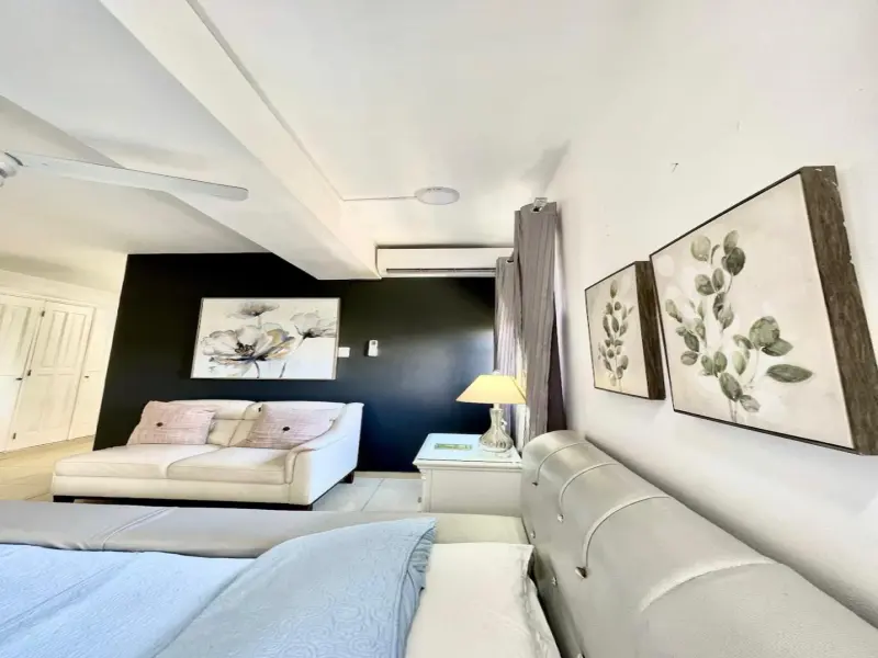 Dispone de aire acondicionado, abanicos, gabinetes en Caoba, puertas y marcos en caoba, ventana en Cristal y closet de pino.